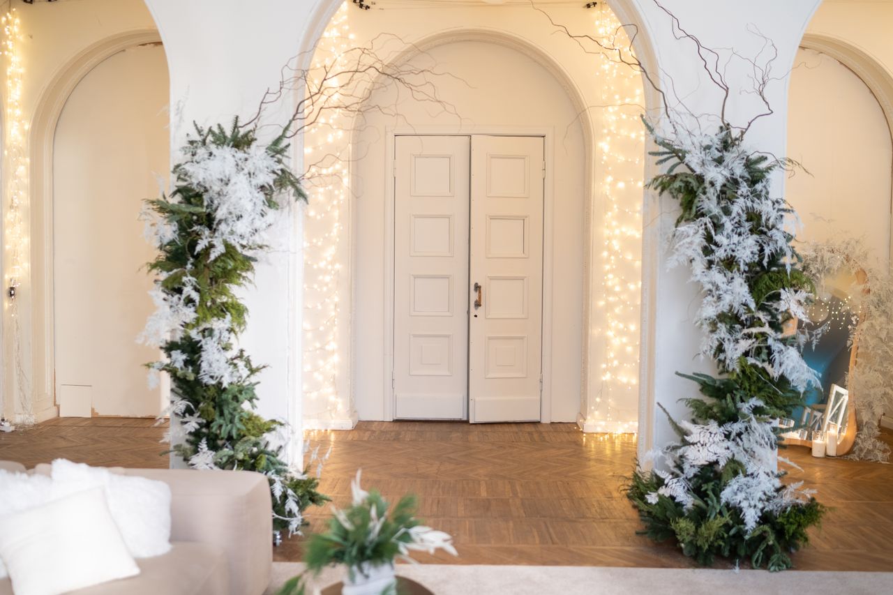 Ялинки на колесах, можна прибрати з кадру. Весь новорічний декор в залі мобільний, можна прибрати з кадру.